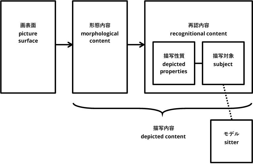 絵は、松永さんの図にあるとおり、まず絵の表面があり、そこから形態的内容が見て取られ、さらにそこから描写性質や描写対象が見て取られ、それらがあわさって描写内容となる。