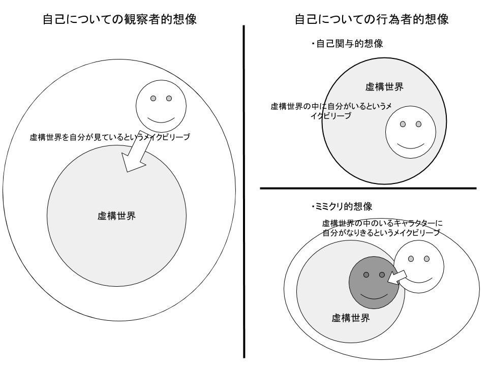 なお、自己関与的想像とミミクリ的想像という言葉は、松永伸司『ビデオゲームの美学』 - logical cypher scape2に出てきた分類を拝借させてもらっている。